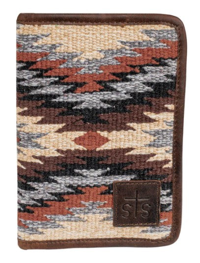 The Guadalupe Serape Magnetic Wallet captures the essence of fall with its rich palette of browns, creams, grays and black colors and is crafted from hand-woven cotton with full grain leather accents for a timeless rustic charm.