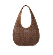 Ariat ladies round shoulder bag from the Paige collection. Brown basket weave woven body with Ariat embossed patch in the center. Two open pockets and one zipper pocket on the inside, 1 back zipper pocket on outside