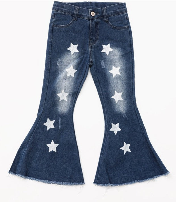 Whether it's for a patriotic celebration, family photos, or everyday wear, these star-printed flare jeans will keep your little one stylish and comfortable. Pair with boots, sneakers, or sandals for a look that works from playground to party!