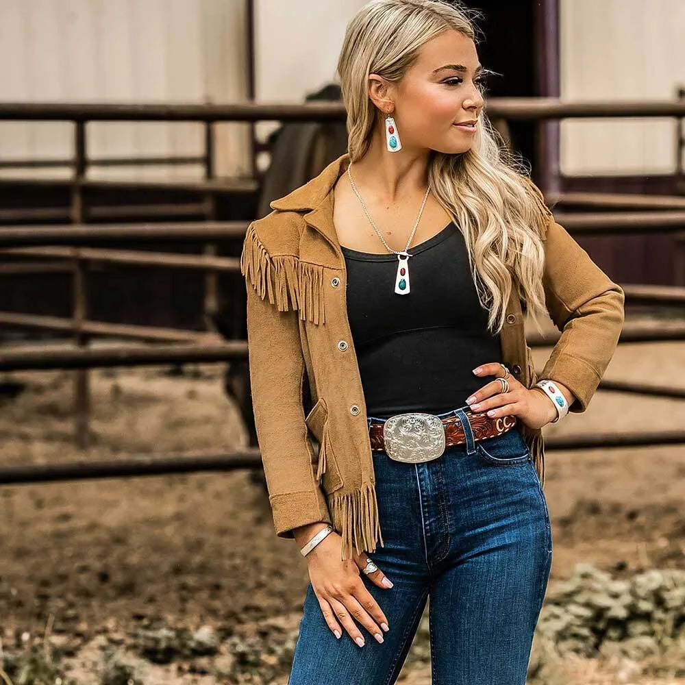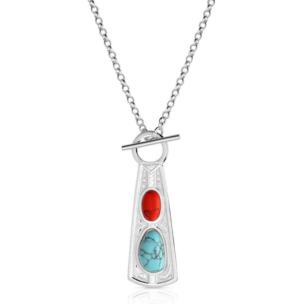Bold, vibrant, and unmistakably Western, the Cowgirl Harmony Necklace is designed to complement your bold Western spirit. It brings together classic craftsmanship and vibrant color in one striking piece. The piece features a unique toggle clasp above the pendant to secure the 22 inch silver tone chain. This necklace is made to stand out, whether layered with your everyday favorites or worn solo for a statement moment. Stone color may vary.