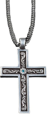 Classic cross pendent with floral scrolling necklace by M&F Western Products. Antique silver finish with an aqua stone in the middle of the cross, all on a 24 inch chain.