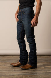 The Roger is a modern take on a classic cut jean featuring a lower rise and slimmer fit. The dark 13 oz denim features 1% spandex for all day wear and rebound, hand sanding with whisker details and rear pocket details.