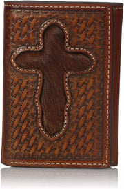 Nocona Western Men Wallet Trifold Leather Weave Hair Inlay Cross Cutout
