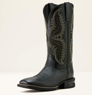 The important things about this boot are the things you cannot see. The upper, the "foot part" is made from neck leather - it has a small pebbled grain, but is the toughest, most durable leather on a hide. The shaft, the "leg part" is made from back hide, and stands upright without needing shaft forms, even after having neatsfoot oil applied to make it more supple. The shock absorber is not a gimmick. I weigh 200lbs and it's just right: some give but not squishy. The sole inserts are comfortable and replaceable. The toe box has good room. I hesitated to buy this boot because it is somewhat expensive, but I got my money's worth. With a little care, I expect these will out wear any two other pairs of cheaper boots, so they will be less expensive in the long haul. For me, Ariat's run 1 size larger than an equivalent sneaker.