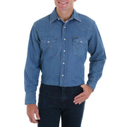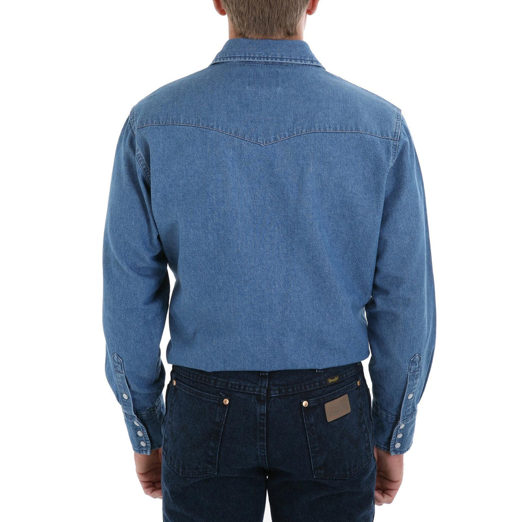 Description: THE ORIGINAL WORK SHIRT FOR COWBOYS One wardrobe staple a cowboy should never be without is a work shirt that can hold its own. That's precisely why our Cowboy Cut® work shirt is designed with hard work in mind, so you can get any job done with total confidence. Every Cowboy Cut® work Western denim snap shirt comes with all the authentic details you'd expect from a tried-and-true Wrangler® essential, including Western front and back yokes, a spread collar, two spade flap snap pockets, the Wrangler® logo riser label on the left pocket, and our decorative 'W' stitching. Just like the jeans in our Cowboy Cut® collection, the Cowboy Cut® Western snap denim work shirt will keep you dressed and ready for anything.