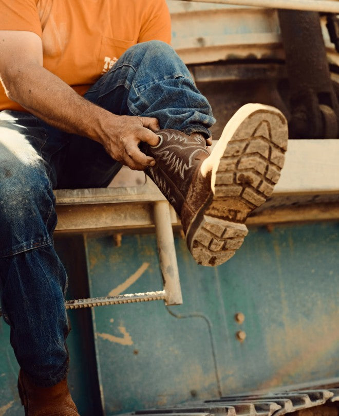 Whether you’re a roughneck, work in commercial construction or just love long days and hard labor, this square toe is a pure Western workhorse. A dual-density cushioned outsole, our own energy-returning Total Energy Command (TEC) insole system, and a removable, cushioned footbed leave nothing on the table by way of comfort. Its deep-lugged MuckOFF Tread repels crud and debris and is oil and slip-resistant, and a breathable barrier and treated leathers will keep your feet dry. This work boot meets the ASTM standards for safety toe, slip-resistance, and electrical hazard protection.