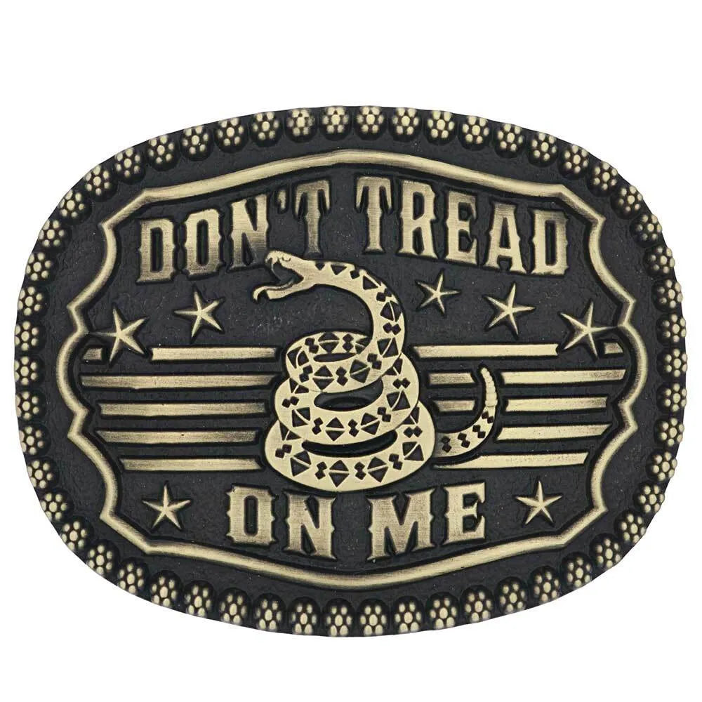 This buckle says it all, "Don't Tread On Me". Show off your love of liberty with gold-toned stars and stripes framing the coiled rattlesnake poised to strike. A solid gold-toned border surrounds the design and the cast oval buckle is surrounded by floral trim. The entire Gadsden Snake Heritage Attitude Buckle is antiqued and has black paint to add contrast. Standard 1.5 inch belt swivel.