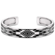 Experience true Southwestern style with Prairie's Call Cuff Bracelet. This bracelet features eye catching geometric patterns giving the design a Southwestern feel. A diamond shape sits at the top of the silver tone cuff bracelet. More geometric etched designs cover the sides of the bracelet and are emphasized by dark black paint. This is a cuff bracelet and is sized to fit most.