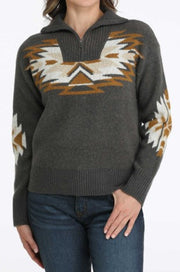 The Cinch Women's Charcoal Aztec Print Mock Neck Quarter Zip Sweater delivers cozy warmth with bold Southwestern-inspired style. Its soft knit construction and ribbed hem provide a flattering fit that layers easily over your favorite jeans or leggings. Perfect for crisp days and cool nights, this sweater is a must-have piece for both comfort and standout design