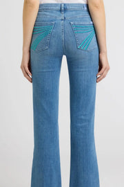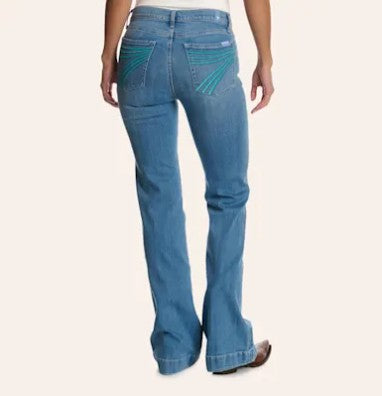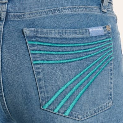 The iconic 7 For All Mankind jean, in a must-have wide leg trouser silhouette - The Dojo. Featuring mid rise and a subtly wider flare alongside the turquoise embroidered 7 pockets. This light blue wash is a timeless wardrobe staple that you'll be loving for years to come.