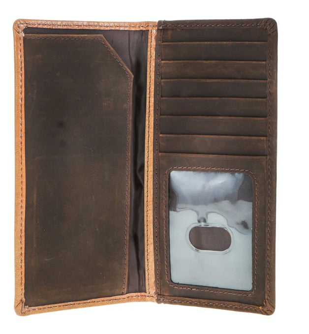 Hit the jackpot with bold western style. This Hooey rodeo wallet brings the energy of Vegas to your pocket with hand-tooled filigree featuring custom poker chips, dice, rope, and a Hooey-branded deck of aces. It's where cowboy grit meets casino flair.