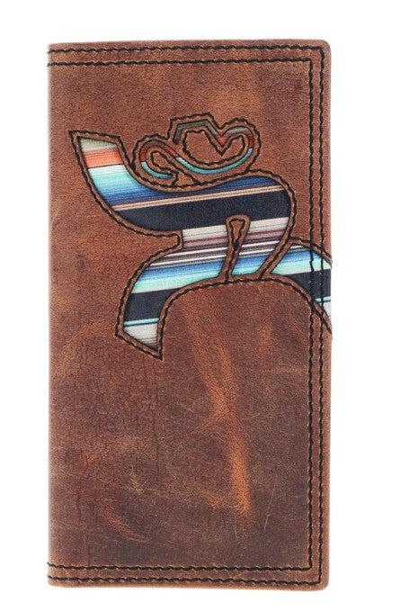 This Roughy Rodeo wallet features a laser cut hands-up Roughy Logo, detailed with Navajo serape print inlay exterior and brown interior, and includes our custom hooey brand woven logo liner.