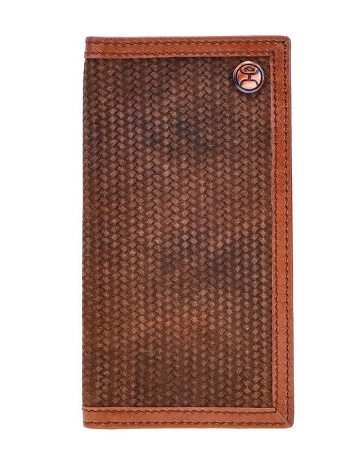 This Hooey rodeo wallet features basket weave embossed roughout detailing with brown leather double welt edge and includes our custom hooey brands woven logo liner.