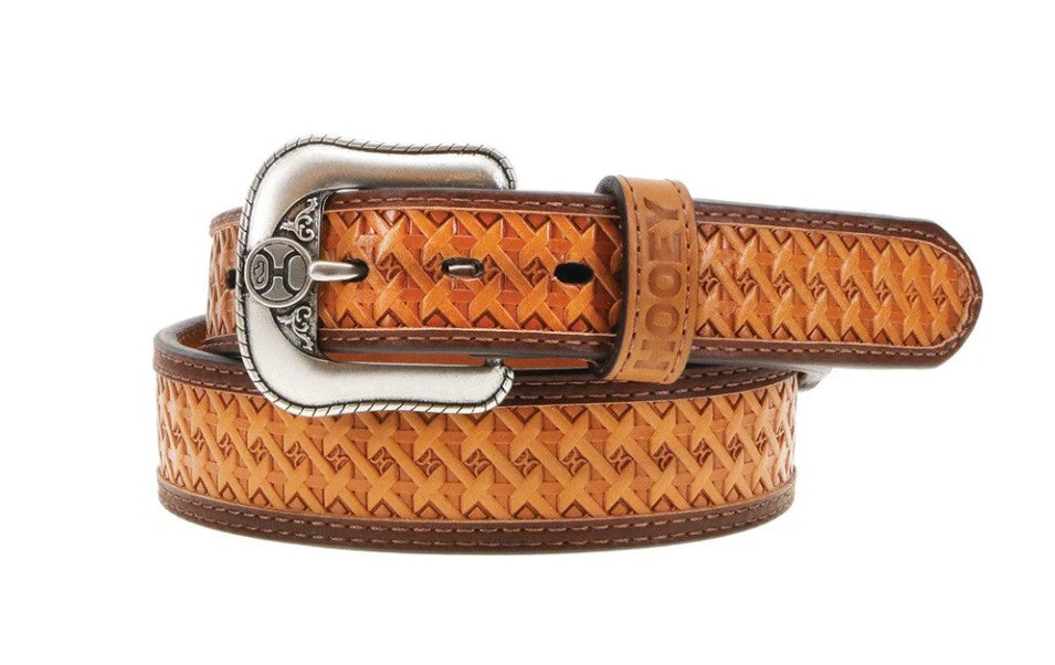 This Hooey classic men's belt features natural basketweave embossed leather, detailed brown double welt edge and accents.