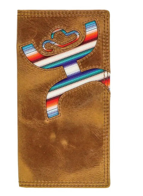 This Hooey rodeo wallet features a laser cut hands-up Hooey Logo, detailed with sunset serape print inlay exterior and tan interior, and includes our custom hooey brands woven logo liner.