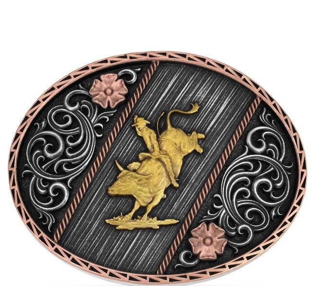 Add a striking finishing touch to any outfit with the Montana Silversmiths Tri Color Rodeo Buckle. A sculpted Bull Rider figure takes center stage in a rustic rose design with etched details, finished in a bold tri-tone combination of rose gold, silver, and gold tone accents. Understated elegance with an antique feel — rodeo charm for any occasion.