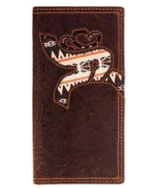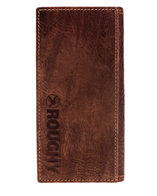 This Roughy rodeo wallet features a brown leather exterior and interior, detailed with laser cut hands up Aztec inlay and includes our custom hooey brand woven logo liner.