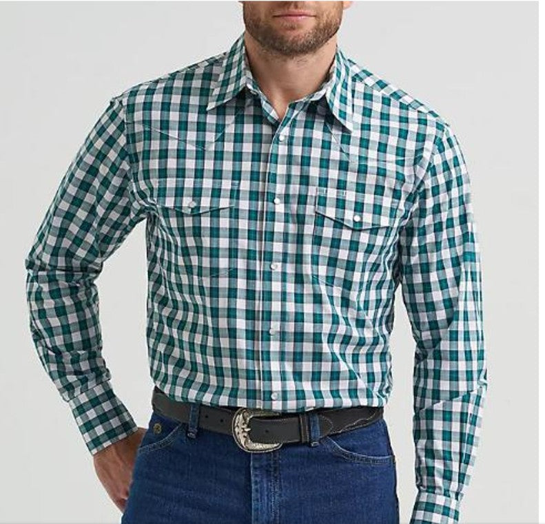 Description: Long Sleeve, Spread Collar, Authentic Western Yokes, Flap Pockets with Snap Closure, Pencil Slot on Left Pocket, Wrinkle Resist Finish, Stretch, Stain Release